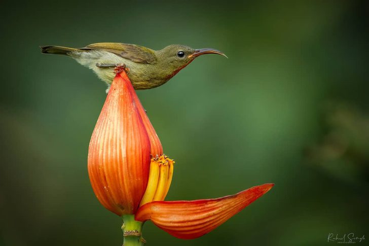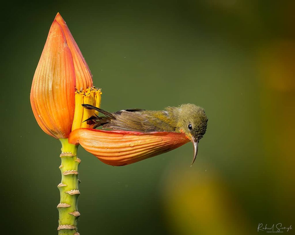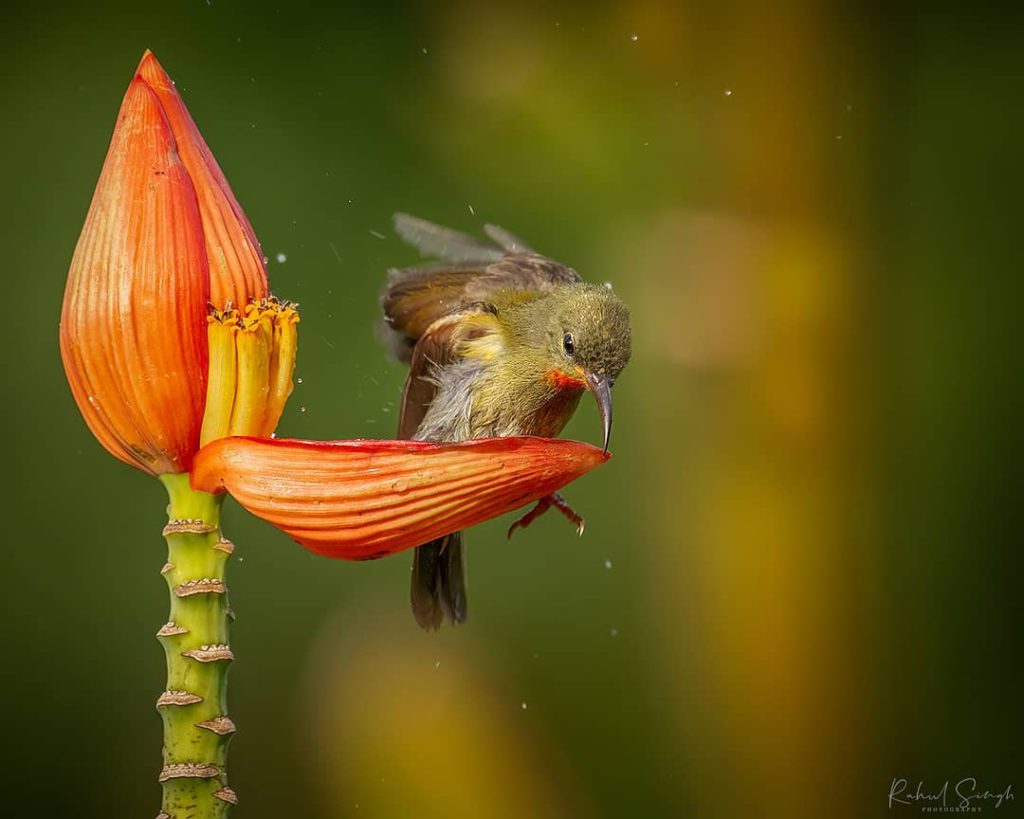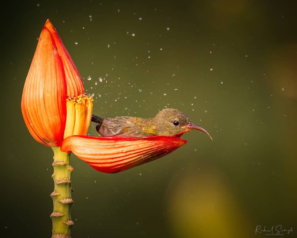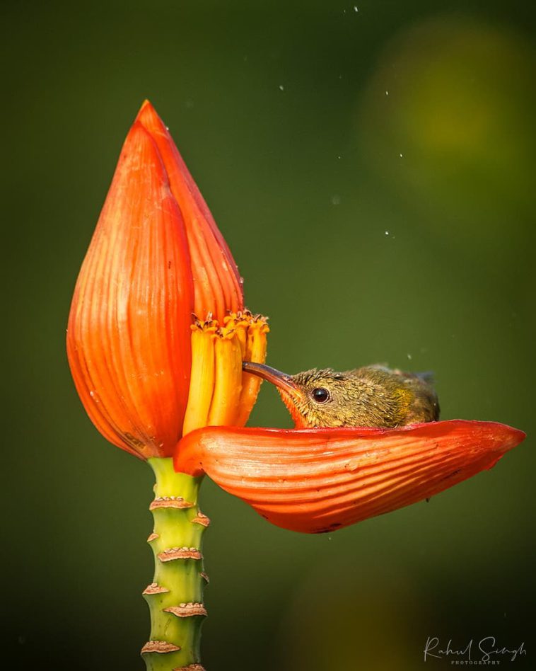 “Everything was fine until the crimson sunbird started bathing in the water stored in the banana flower petal. I was taken aback.”