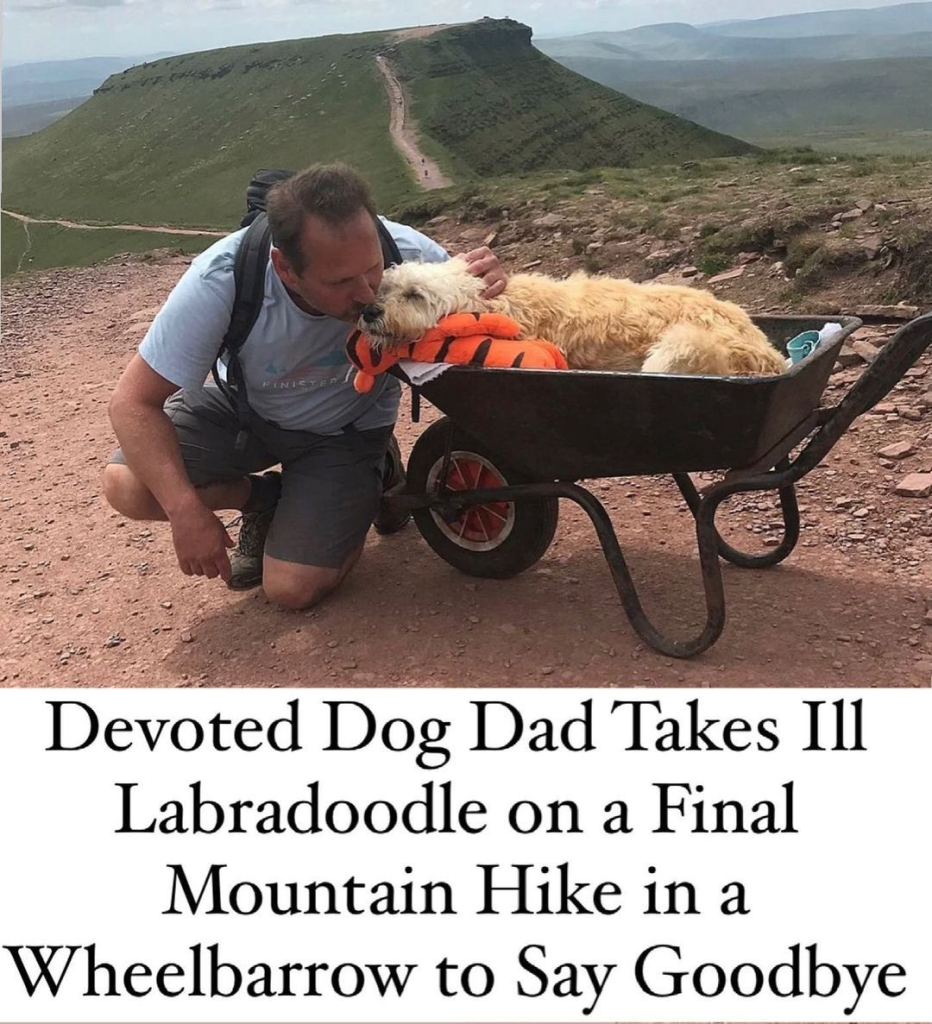 Photos of the wheelbarrow ride, captured by strangers on the trail, quickly spread online. News outlets from the UK to the US shared Monty’s story — not as a tale of loss, but one of unconditional love, dignity, and kindness.